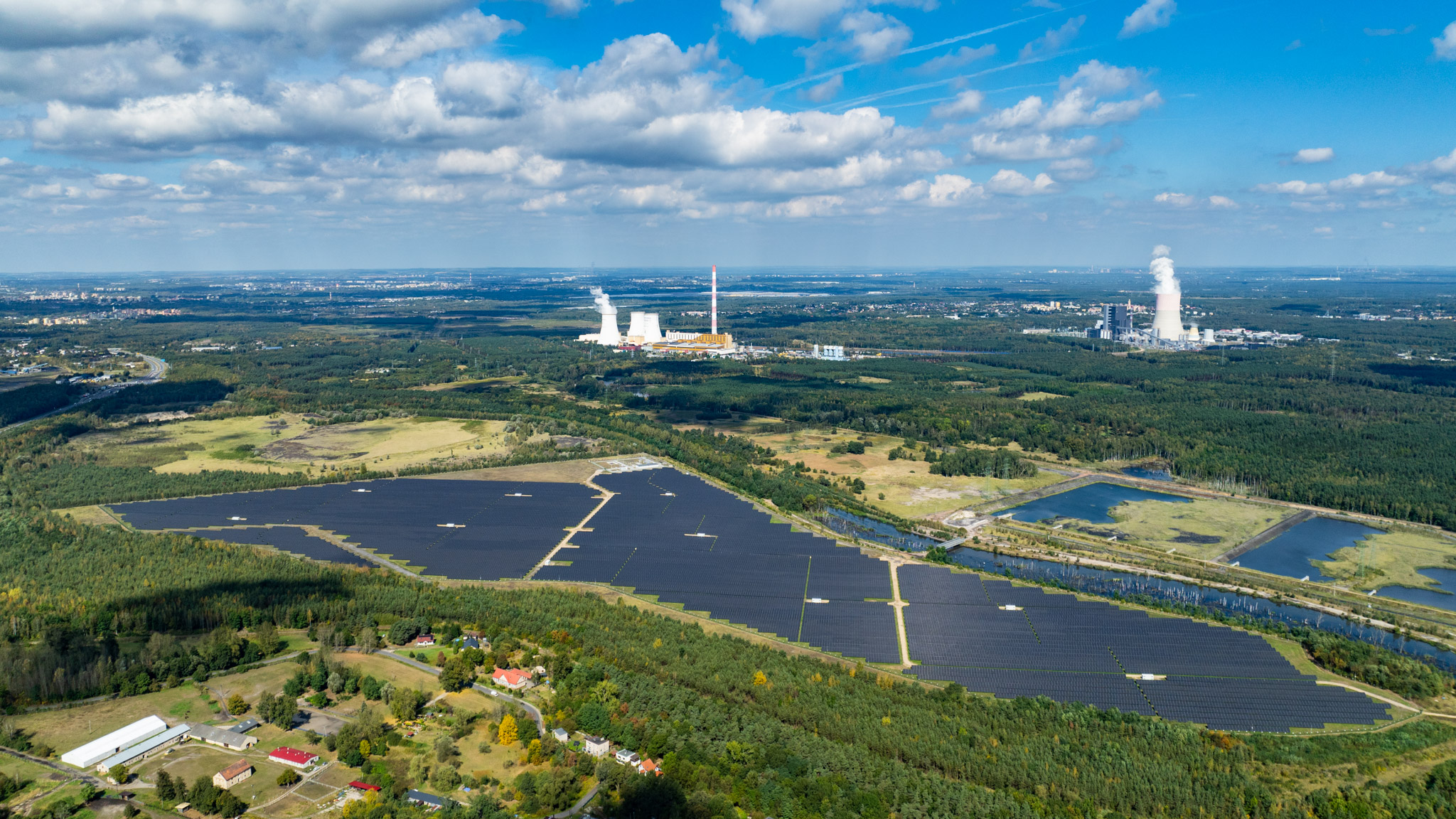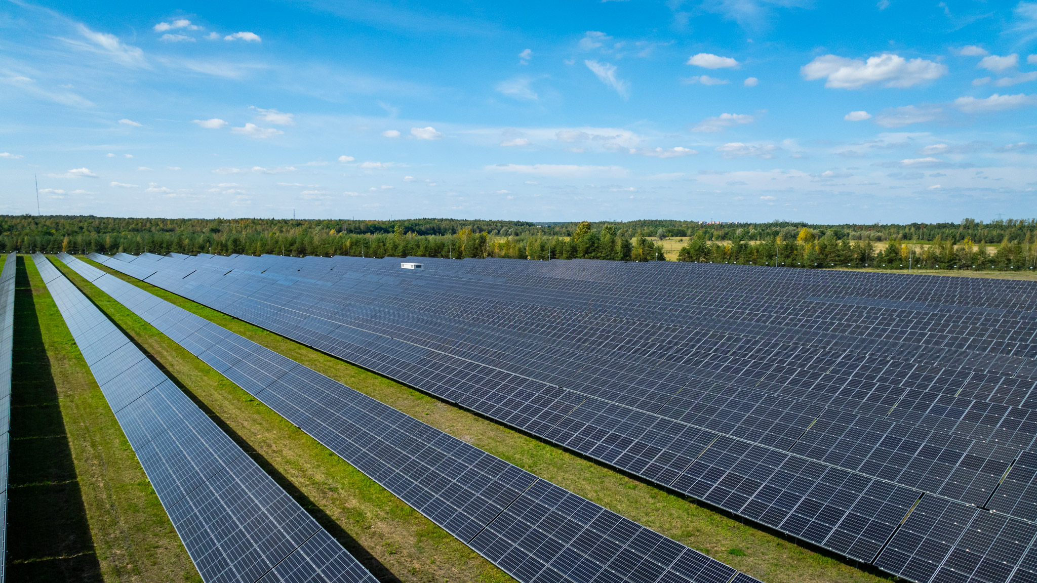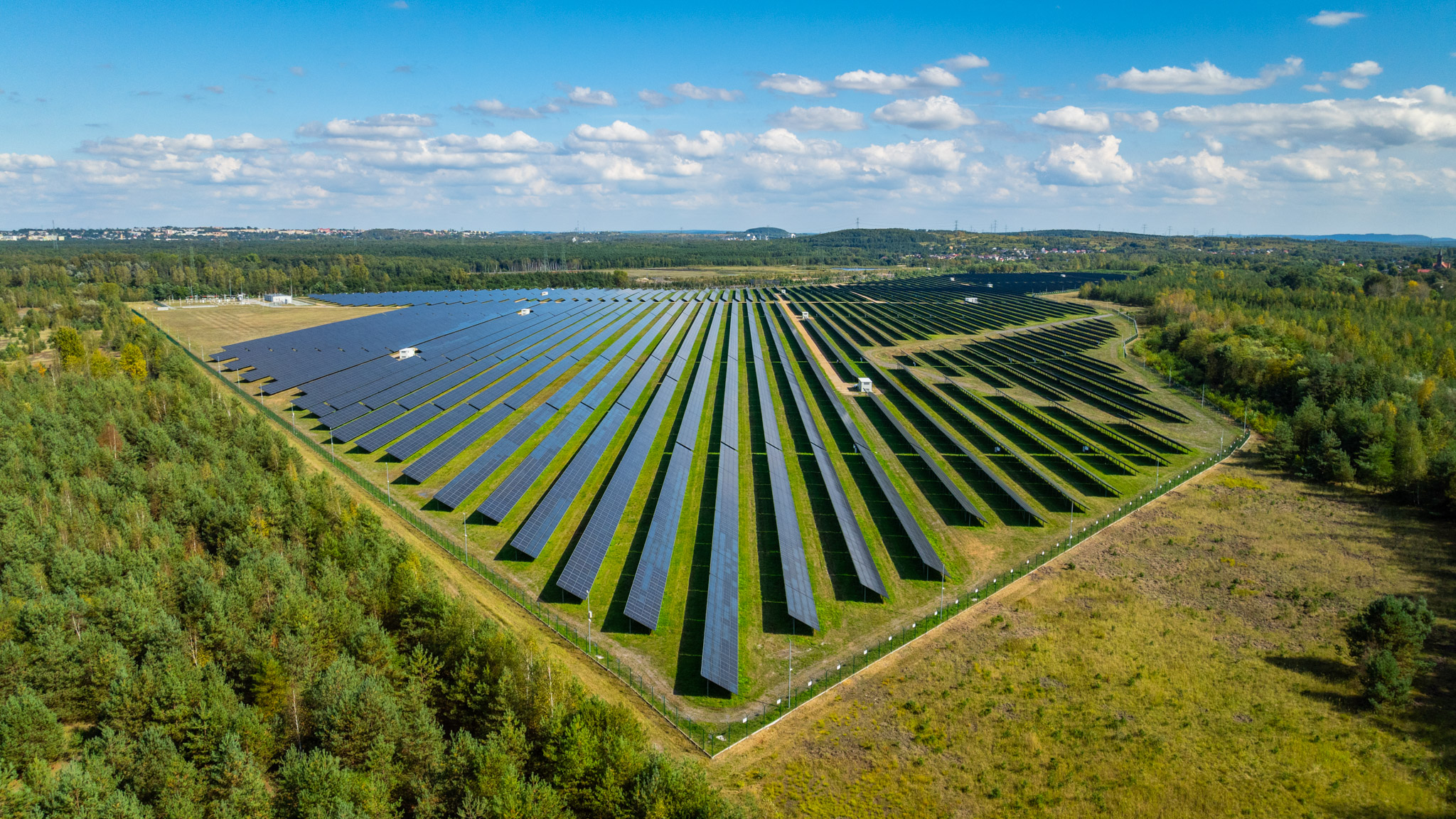 Uchwyciliśmy z lotu ptaka jedną z farm fotowoltaicznych, pokazując skalę i innowacyjność tej inwestycji w odnawialne źródła energii.